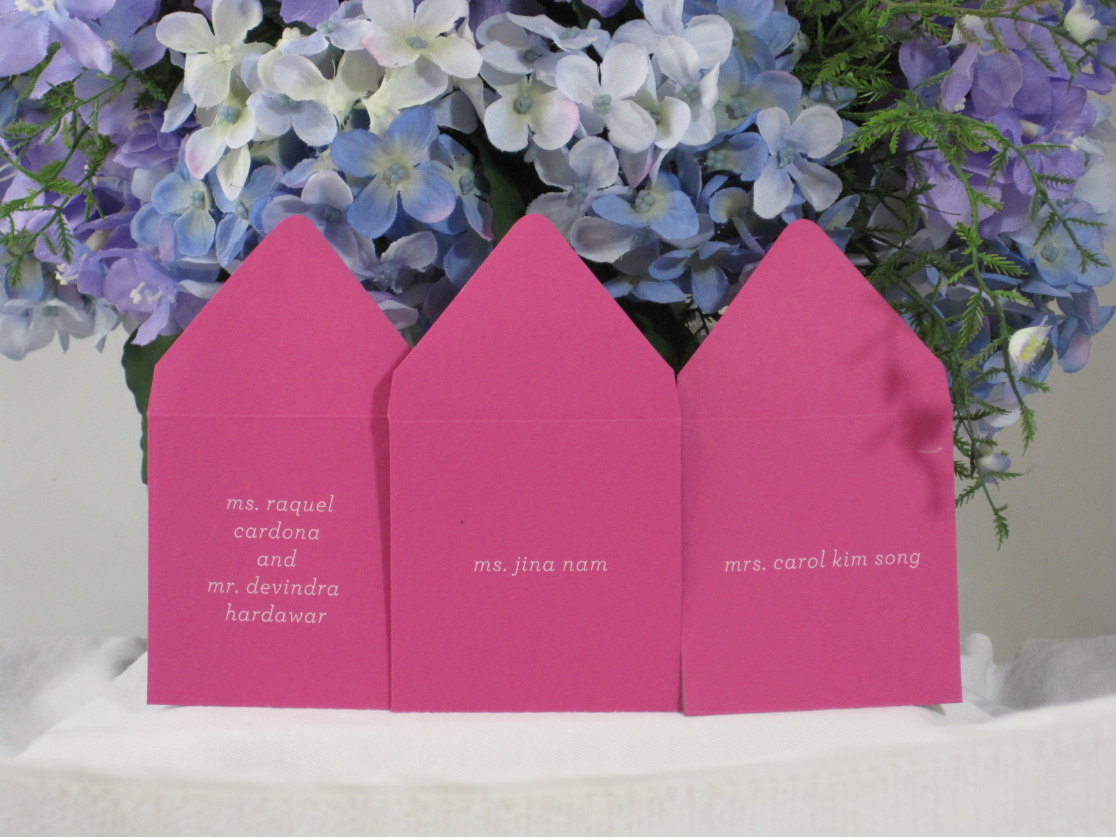Hot pink escort envelopes with white ink