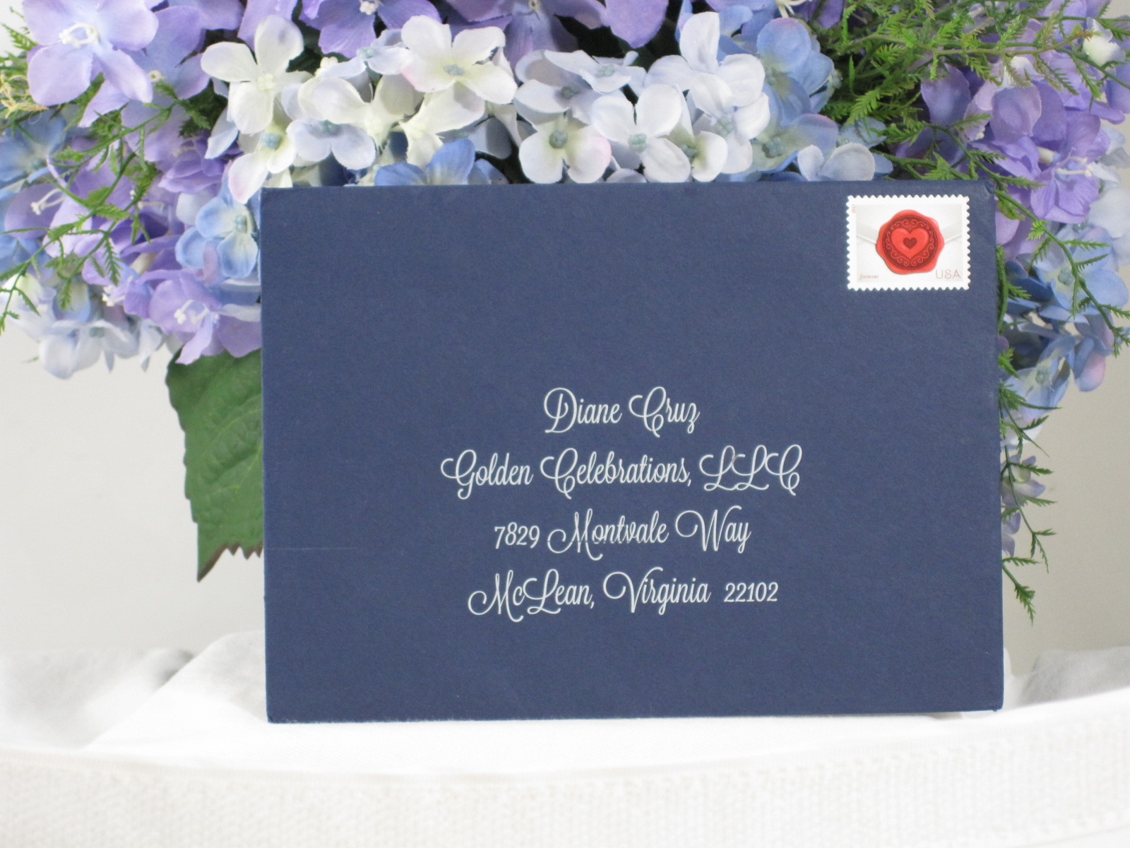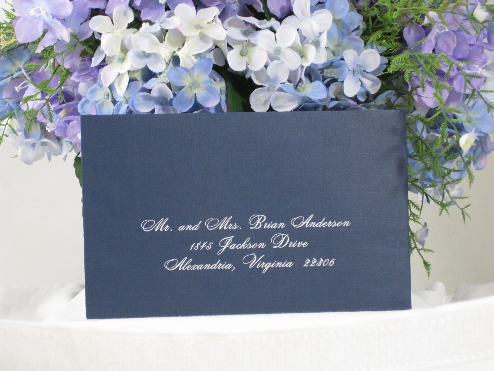 white ink on navy envelopes