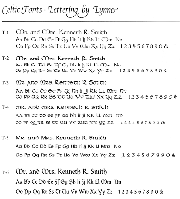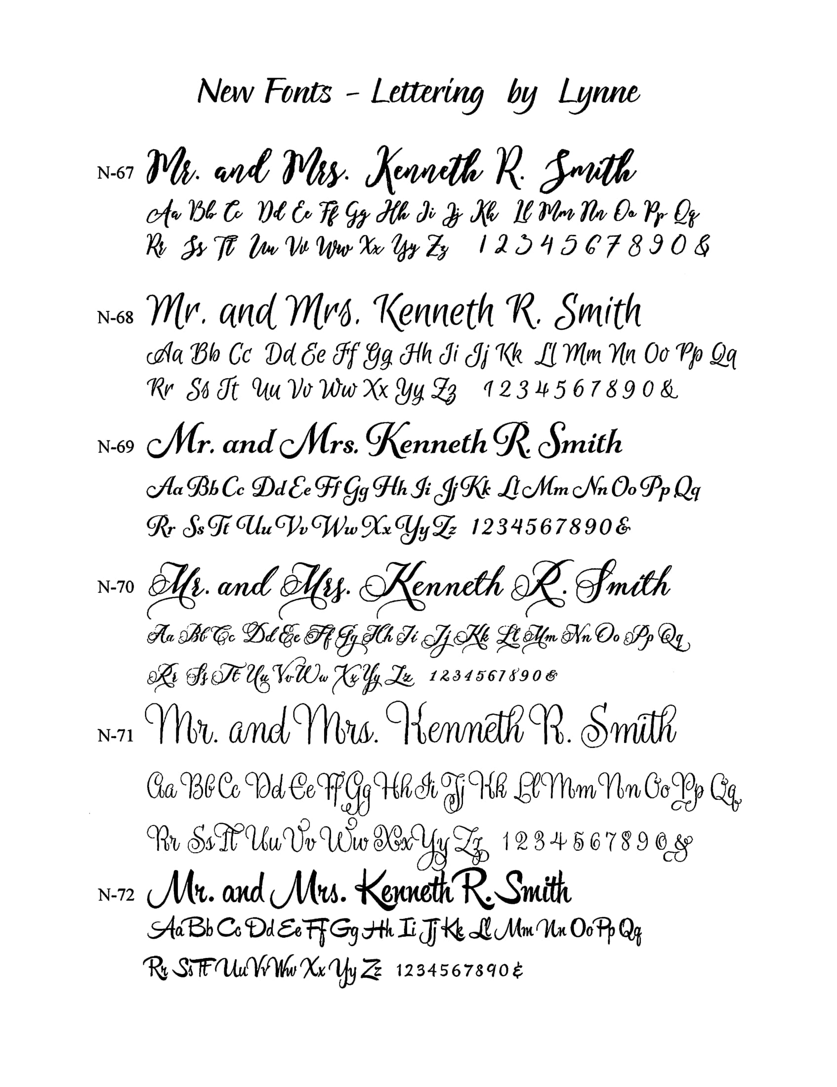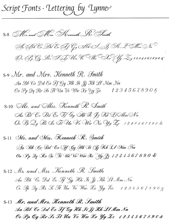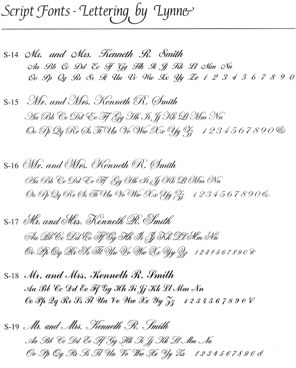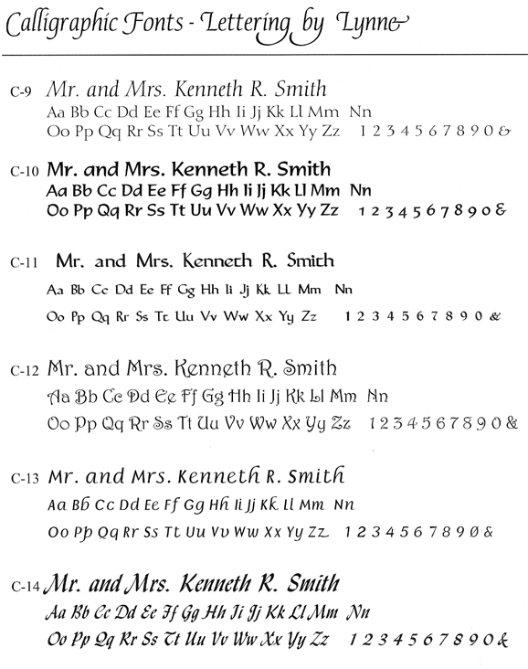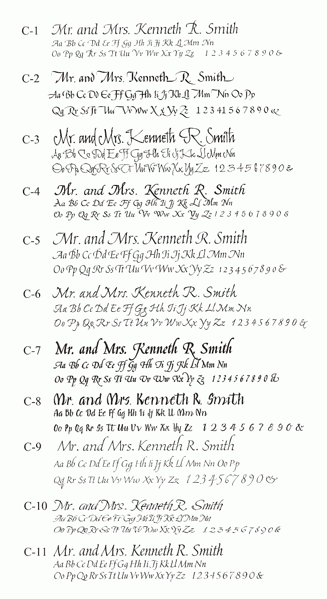 Review below the wide selection of fonts we offer for addressing your invitations, place cards, etc...