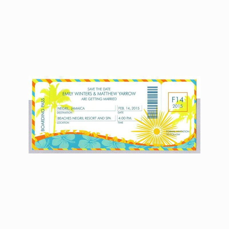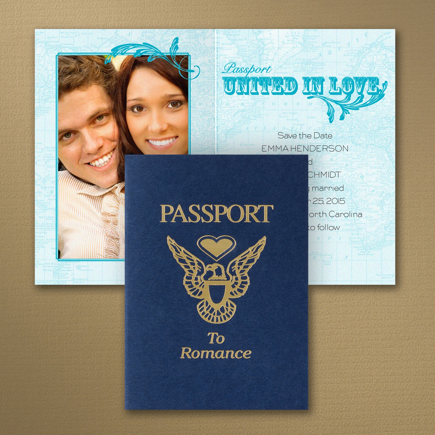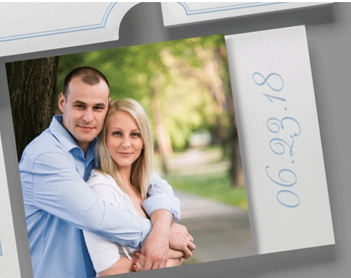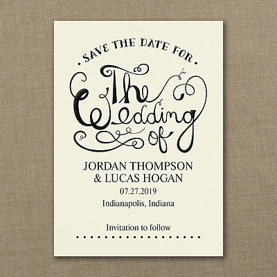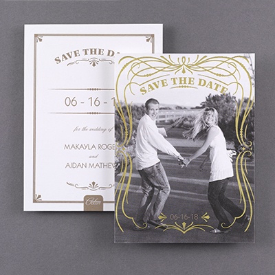 Large black & white photo with rose gold foil for "Save the Date", information text below in white