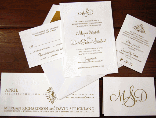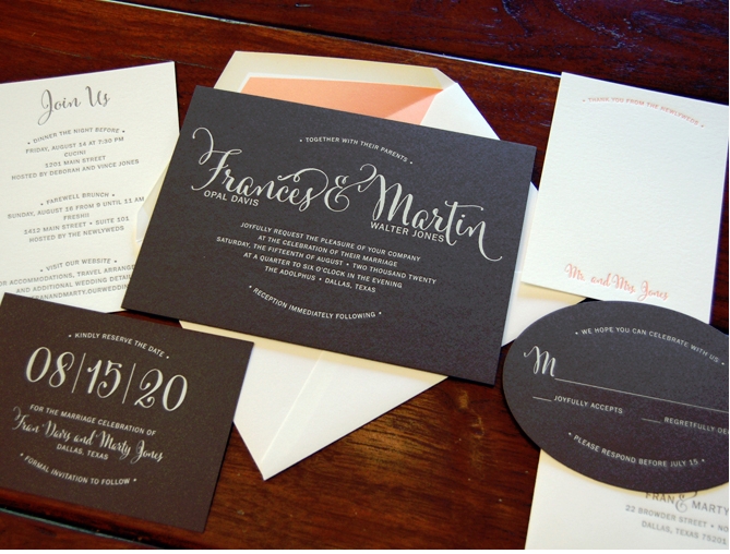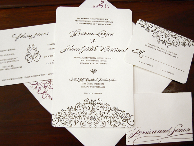 Curved die-cut letterpress card with mongram, and unique enclosures
